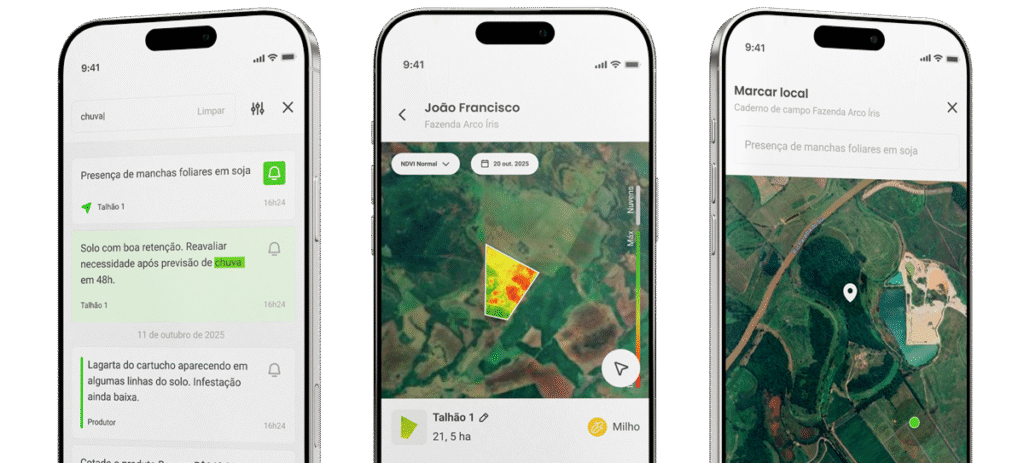 Após enviar, você recebe um link para agendar o melhor horário. Na demo, mostramos o app e o painel funcionando com dados reais do campo.